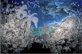 Edouard Duval-Carrié (1954- ) is a Haitian-American mixed-media painter and sculptor whose art focuses on the overlooked prosperity of Haitian culture, its complex sociopolitical history, and Vodun—an African diasporic religion based in Haiti and other parts of the West Indies. The surreal settings interpret Haitian history and the present. Using translucent mediums, such as glitter, glass, and resin, he invites visitors to reflect on the multiplex histories within Haiti.