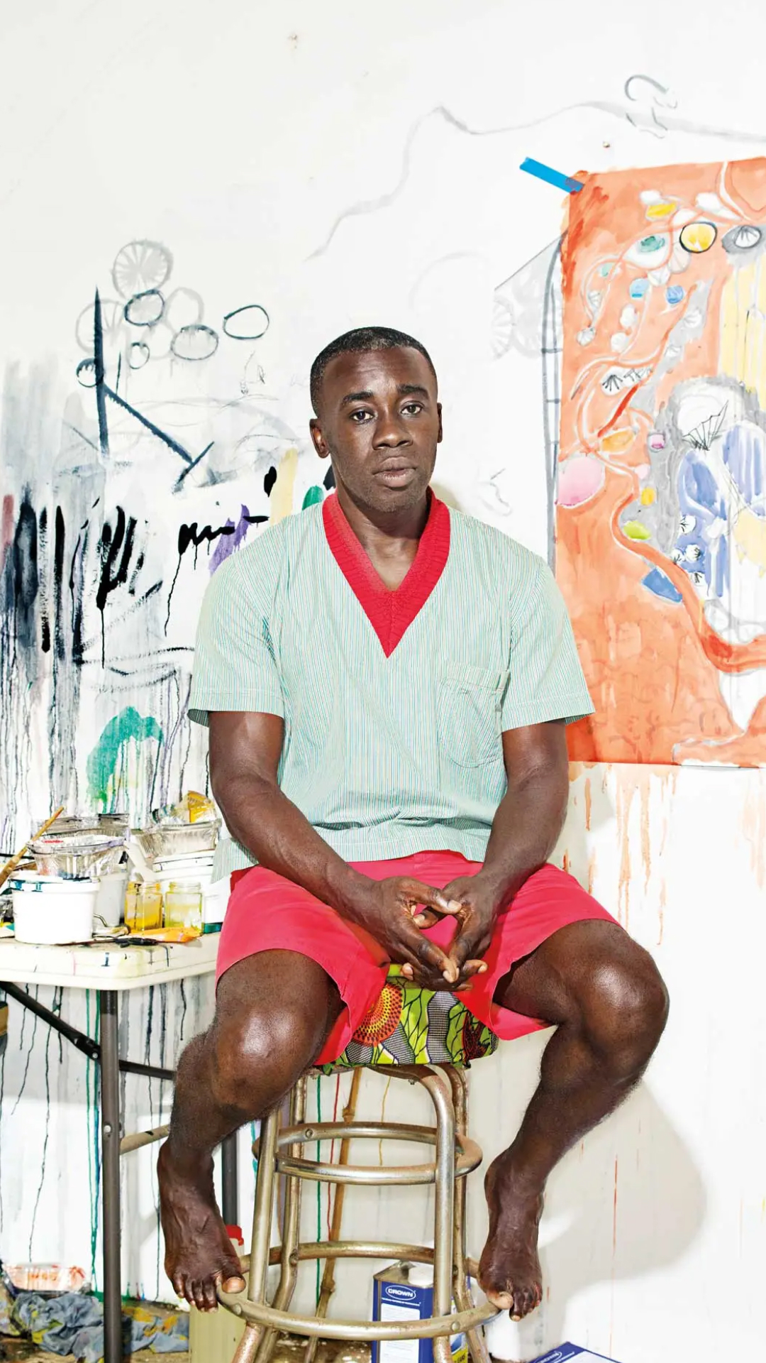 Esther Ofosu (1987- ) is a Ghanaian multidisciplinary artist who works and sculpture and painting Her work evokes emotions drawn from issues happening in and around her environment. In her current work, she puts thousands of rattan shavings together, plaits them into thick heavy strands, dyed, coiled, and converts into fluffy circular mats, objects, and installations. By going through these processes, she explores and expands the ideologies of craft labor into various dimensions to include support and the body.